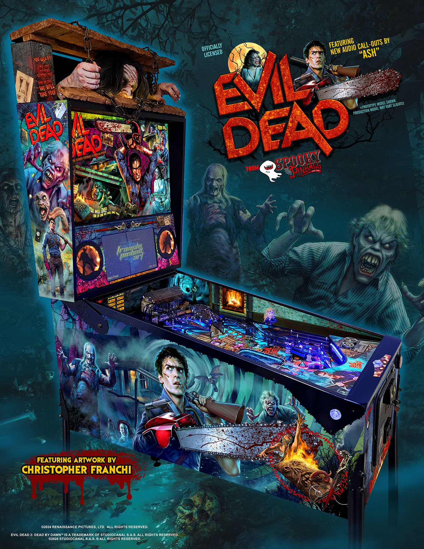 Playfield inspired by Evil Dead movies, featuring Ash, Deadites, and iconic scenes from the films