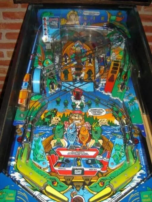 The game’s theme is fishing, with a general goal of catching as many fish and telling the biggest lies about their size possible. The machine’s backglass is topped with a plastic fish that thrashes its tail when the player achieves certain goals, and the players launches balls with an autoplunger shaped like a fishing rod.