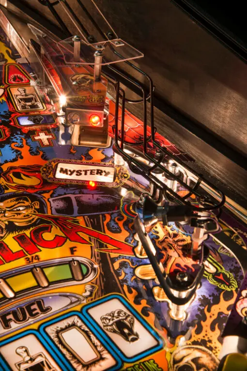 Metallica pinball includes 12 ‘Tallica songs with “Master of Puppets,” “One,” and “Fade To Black” among them. Features include an electric chair, snake, grave markers and lots of other bells and whistles along with art by our friend Dirty Donny.