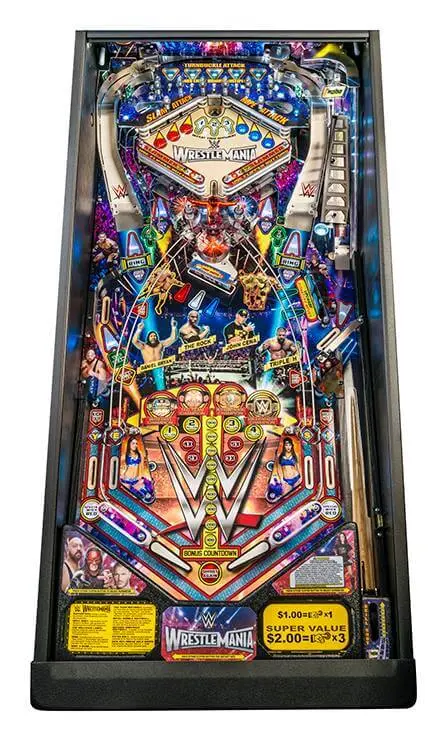 The WWE Pro and the Limited Edition machines feature an innovative upper pinball playfield wrestling ring. With the flipper buttons, players control two Slammer slingshot-style kickers in the ropes of the ring. Completing the three drop target bank starts a wrestling match. Players rack up points and pin opponents in the ring by shooting into a kick out hole. Keeping the ball in the ring and hitting as many targets as possible will advance players through the match. Multiple ramps guide the ball throughout gameplay, while brilliant lightshows highlight the all LED playfield. Ten licensed songs include intro music for wrestlers that players choose. WWE announcers Jerry The King Lawlor and Michael Cole add play by play excitement.